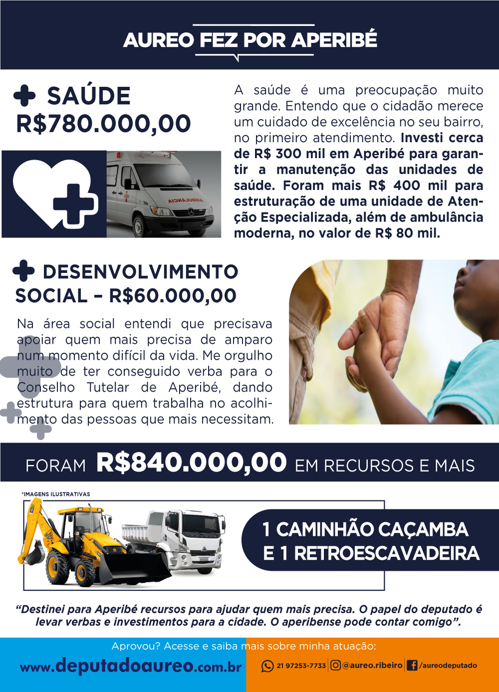 O deputado federal Aureo Ribeiro já destinou mais de R$ 4,5 milhões para Aperibé. A partir disto, esses investimentos trouxeram melhorias reais para a saúde, a infraestrutura e os serviços públicos da cidade.
